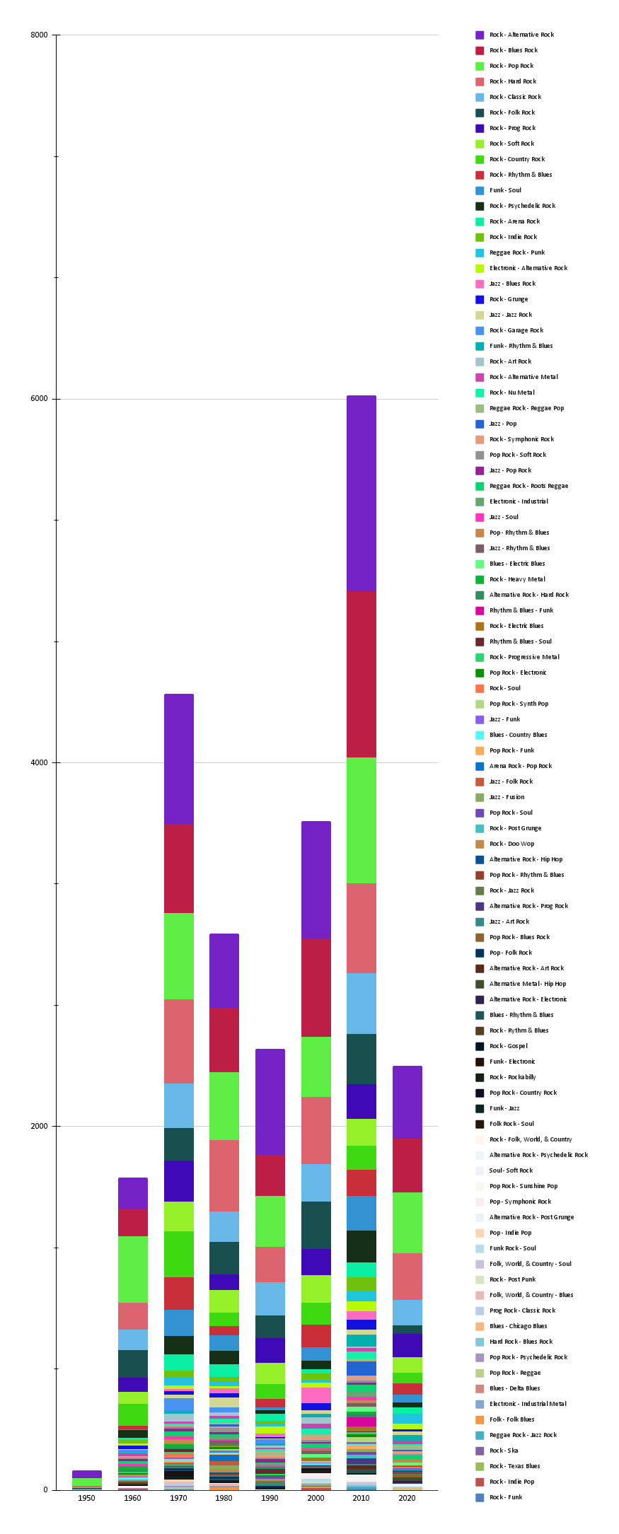 Smaller but notable presences: Arena Rock, Indie Rock, Grunge, Garage Rock, Jazz Rock. Although “Rock” dominates on paper, the soundscape spreads across blues, soul, funk, folk, and even electronic corners.